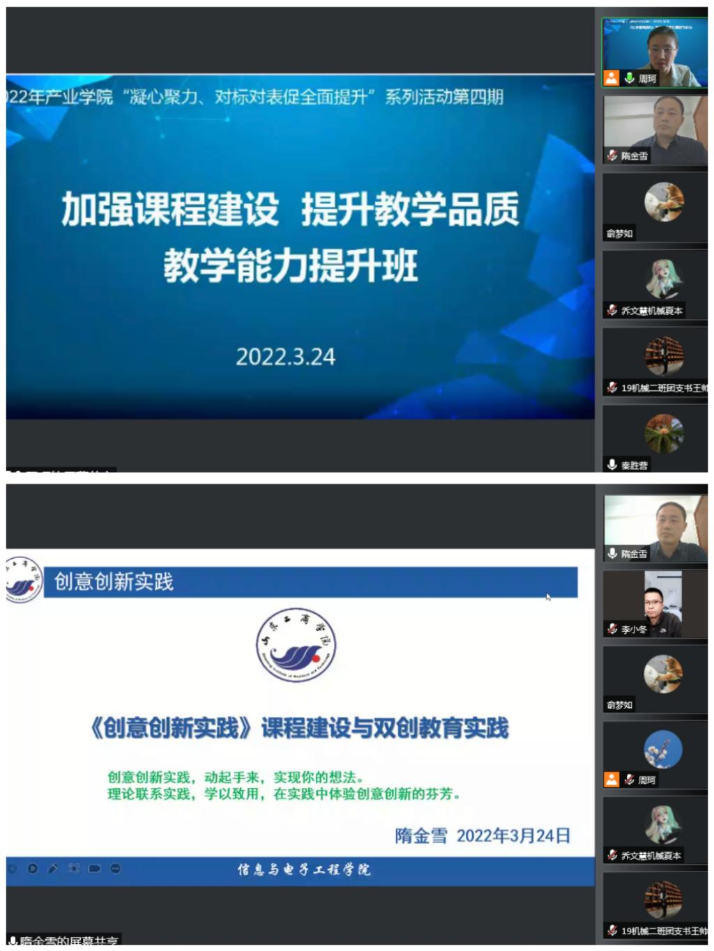 3月24日下午,产业学院通过线上会议召开2022年“凝心聚力、对标对表促全面提升”活动第四期——课程建设与双创教育能力提升培训班,会议邀请国家一流课程负责人隋金雪作主题为“《创意创新实践》课程建设与双创教育实践”的报告,产业学院全体教职工,各专业学生创新实验室成员,各班班长、团支书、学习委员等参加会议。隋教授任山东工商学院信息与电子工程学院副院长,所教授的《创意创新设计实践》在2020年获批首批国家和山东省一流本科课程,出版多部学科竞赛实践创新相关教材,指导学生获省部级以上奖项300余项(其中国家奖40余项),先后被评为山东省高等学校创新创业教育导师、山东省优秀科技创新导师。