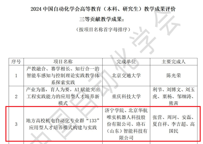 近日,2024中国自动化学会高等教育(本科、研究生)教学成果评价结果公告正式发布,我校伟德victor1946院长张营教授牵头,与北京华航唯实机器人科技股份有限公司、珞石(山东)智能科技有限公司共同申报的《地方高校机电自动化专业群“133”应用型人才培养模式构建与实践》项目获2024中国自动化学会高等教育(本科、研究生)教学成果评价三等奖。
