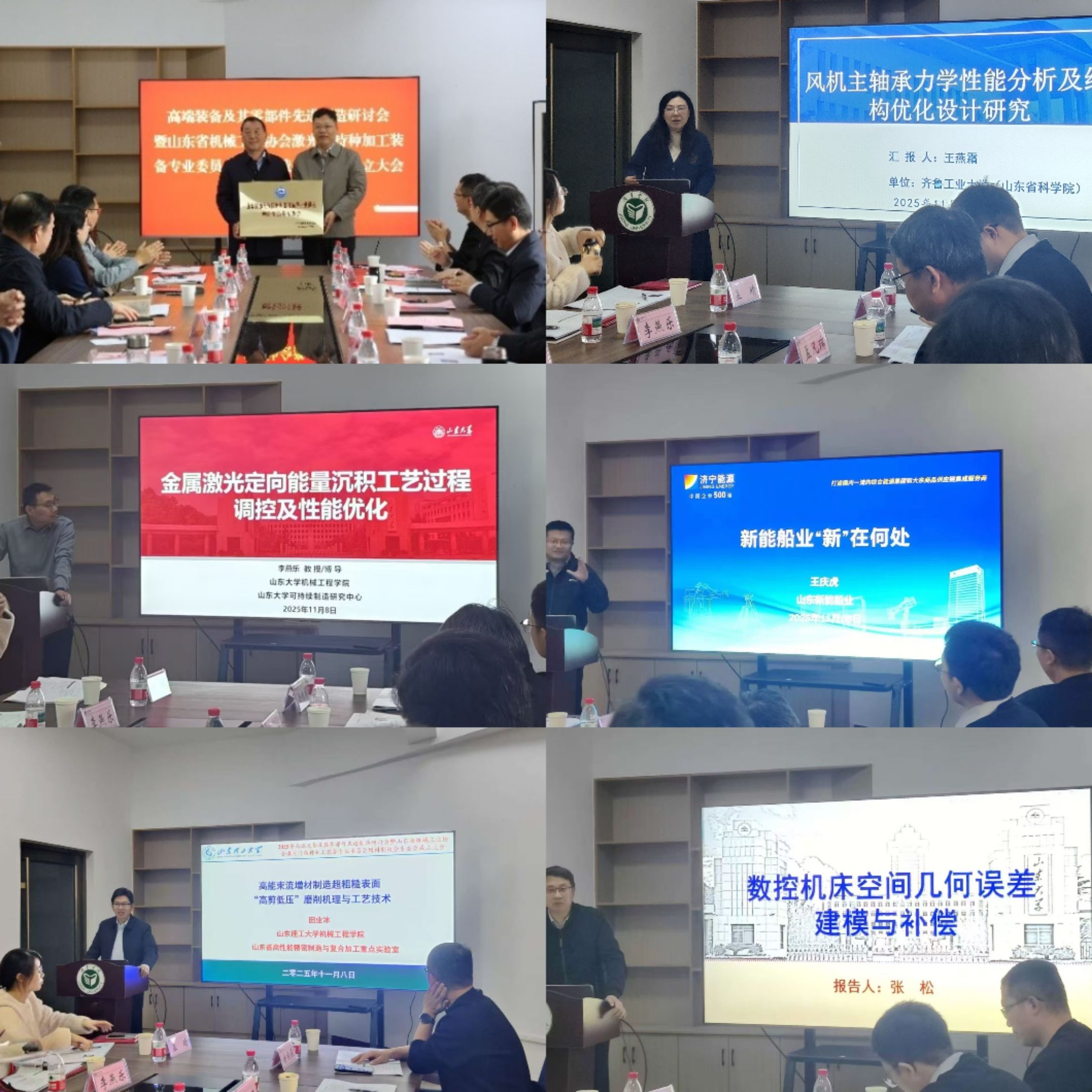 研讨会上,山东大学教授张松、李燕乐,山东理工大学教授田业冰,齐鲁工业大学教授王燕霜,山东新能船舶有限公司党委委员、副总经理王庆虎,分别围绕《数控机床空间几何误差建模与补偿》《金属激光定向能量沉积工艺过程调控及性能优化》《高能束流增材制造超粗糙表面“高剪低压”磨削机理与工艺技术》《风机主轴承力学性能分析及结构优化设计研究》《新能船业“新”在何处》进行了5场学术报告。