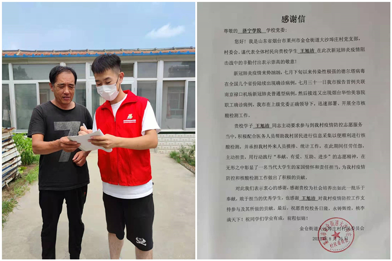 夏日炎炎,酷暑难耐,暑期随着疫情防控形势严峻复杂,为铸牢“外防输入、内防反弹”的坚固防线,我院学生王旭洁作为大学生青年志愿者参与到了所在村镇疫苗接种点、社区核酸检测点、乡镇防疫宣传工作,在疫情防控中展现新时代青年的担当,受到当地社区和居民的高度评价。