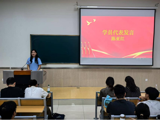 陈亚红代表参会学员发言,作为新时代的青年学生,我们深刻认识到肩负的责任与使命,努力成为一名坚定的青年马克思主义者。珍惜此次学习机会,遵守学习纪律,不断提高自身的思想政治素养和综合能力,并将所学知识运用到实际行动中,带动身边更多同学共同进步。