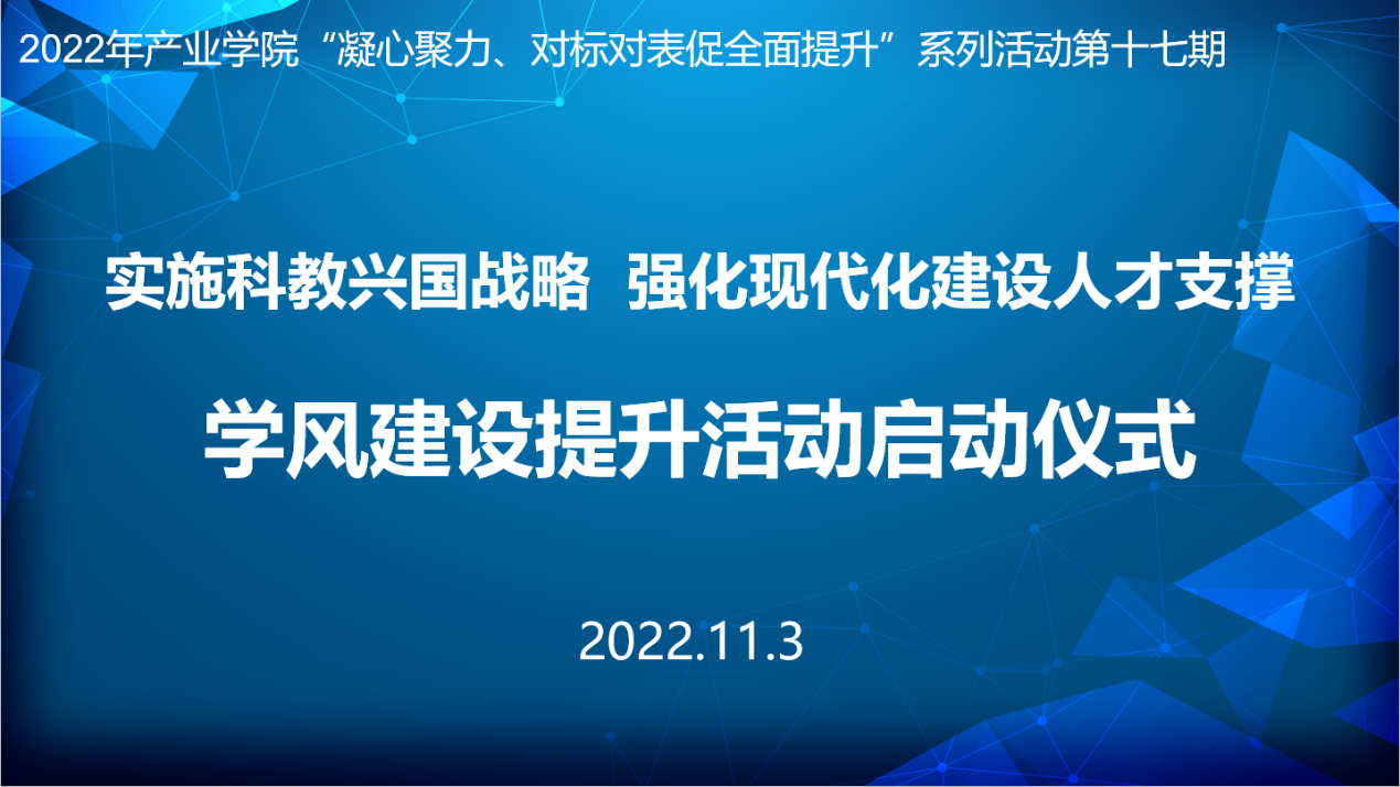 学风建设提升是产业学院“凝心聚力、对标对表促全面提升”系列活动之一。学院坚持以德育铸学风、教风带学风、寝风促学风、服务推学风、管理督学风为抓手,通过系列主题教育活动引导学生明确学习目标,增强学习动力,掌握学习方法,培养多元兴趣,形成勤于学习、善于思考、刻苦钻研、团结协作、诚实守信、比学赶帮超的良好学风氛围。