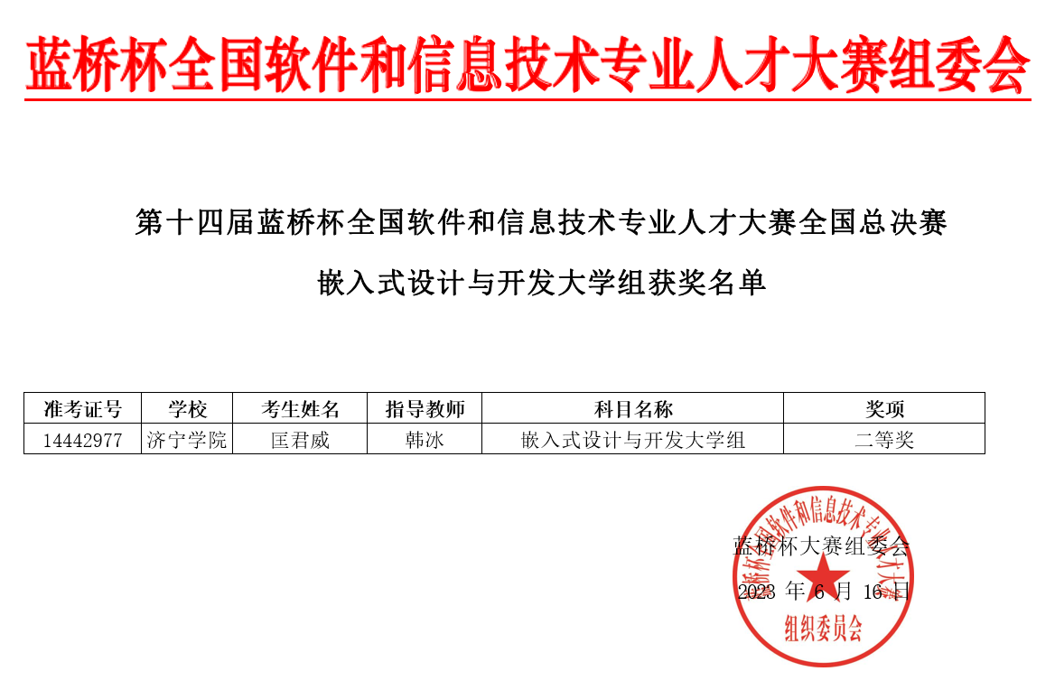 6月16日第14届“蓝桥杯”大赛全国总决赛成绩公布,产业学院学子匡君威在山东科技大学赛点参加了嵌入式设计与开发大学组的竞赛科目的角逐,获得全国二等奖。本次比赛是产业学院首次参加“蓝桥杯”大赛,省赛共选派9名学生参加,7名学生获奖,1名学生进入国赛,最终获国赛获二等奖,获奖比率实现新突破。