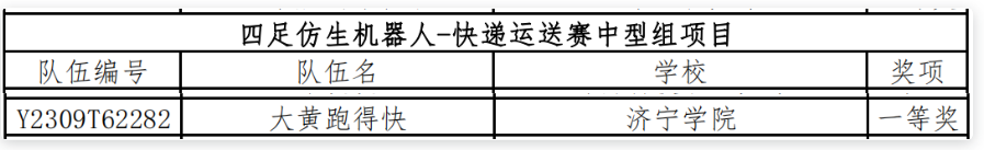 10月27日,“2023中国机器人大赛暨RoboCup机器人世界杯中国赛”决赛成绩发布,产业学院学生参加的“四足仿生机器人快递运送赛项中型组”比赛,获得一等奖。