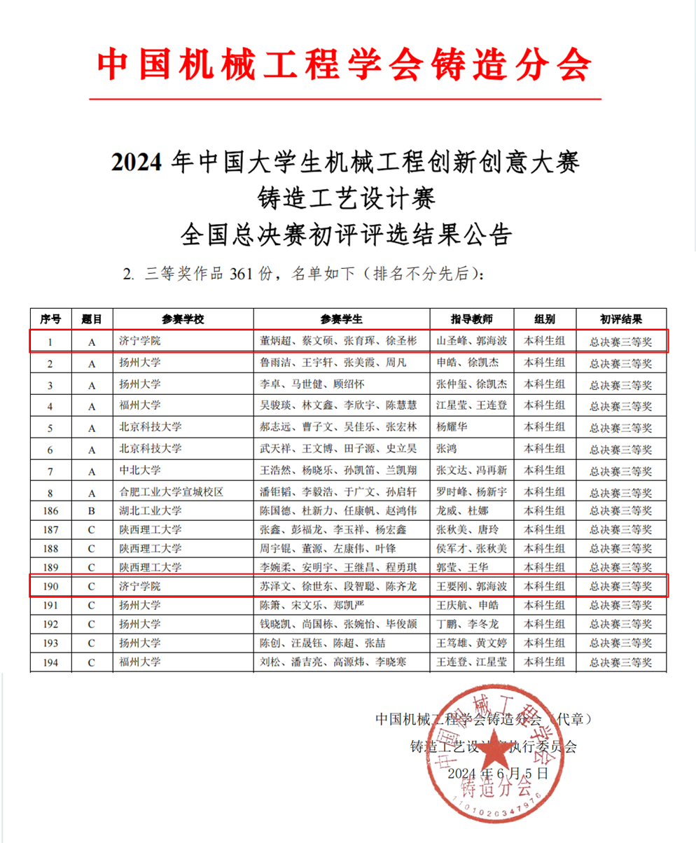 近日,由中国机械工程学会主办,中国机械工程学会铸造分会承办的“2024年中国大学生机械工程创新创意大赛:铸造工艺设计赛全国总决赛”在辽宁省沈阳市圆满落幕。本次国赛共有来自全国132所高校的1715份作品参加,经过评审专家盲审、区域赛和全国总决赛评审等环节激烈角逐,我校伟德victor1946学生在本次大赛中荣获全国总决赛三等奖2项。