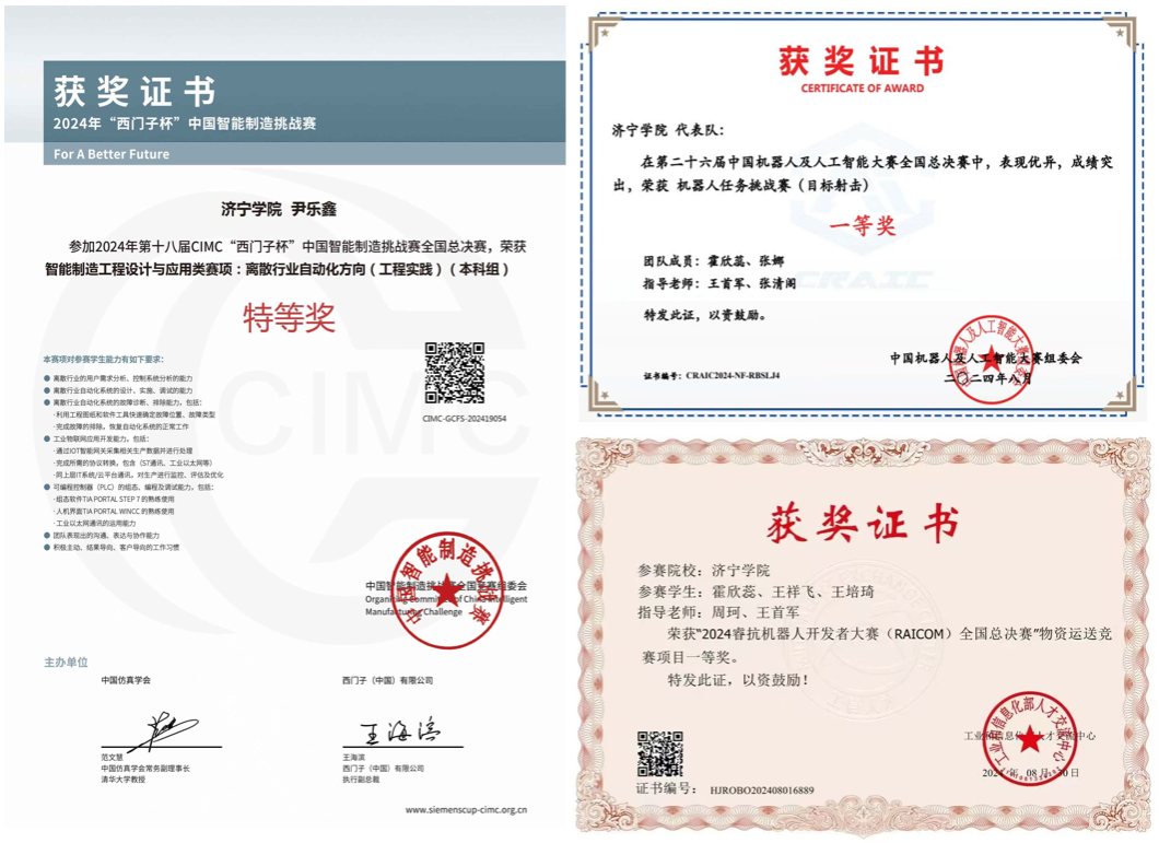 “智行跃升榜”学科竞赛获奖涵盖18个国家级赛事,涉及机械设计、智能制造、机器人、电子技术、自动控制等多个领域,充分检验了学院智学智创建设成效,学科专业竞赛、双创竞赛参与率95%。2024年度,共获“全国普通高校学科竞赛排行榜”国家级奖励31项,其中国家特等奖1项,国家一等奖6项,国家二等奖9项,国家三等奖15项;获省级奖励101项,其中省级特等奖4项,省级一等奖17项,省级二等奖36项,省级三等奖44项;获山东省大学生创新创业计划项目2项。