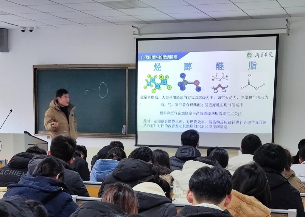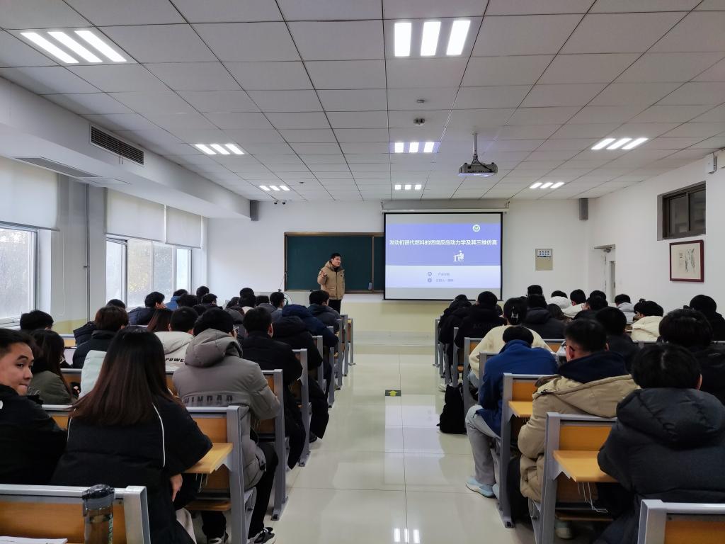 论坛中,景峥博士所作报告题目为《发动机替代燃料的燃烧反应动力学及其三维仿真》。报告首先对燃烧的概念和研究发展进行了介绍;然后对燃烧涉及的理论体系进行了总结并引出了化学动力学机理的重要性;最后对计算流体力学耦合替代燃料简化机理的研究方法在提高发动机燃烧效率与控制燃烧污染物排放所起作用进行了举例说明。报告与大家分享了专业前沿研究方向,开阔了学生视野。
