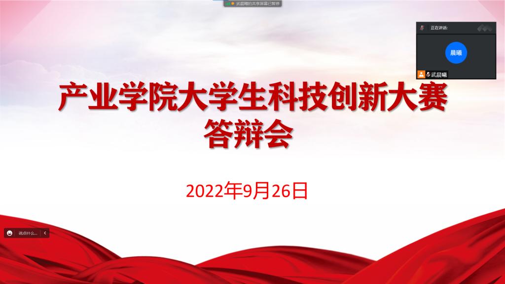 为树立学生的创新观念,增强创新意识,鼓励学生积极参与第九届山东省大学生科技创新大赛,同时为更好地促进大赛的开展,提高学生创新项目的质量,产业学院于2022年9月26日举办线上答辩推选会。本次答辩会特别邀请产业学院评审委员会主任山圣峰、成员宋文龙、王首军、张清阁、韩冰五位老师担任评委。武晨曦担任主持人。