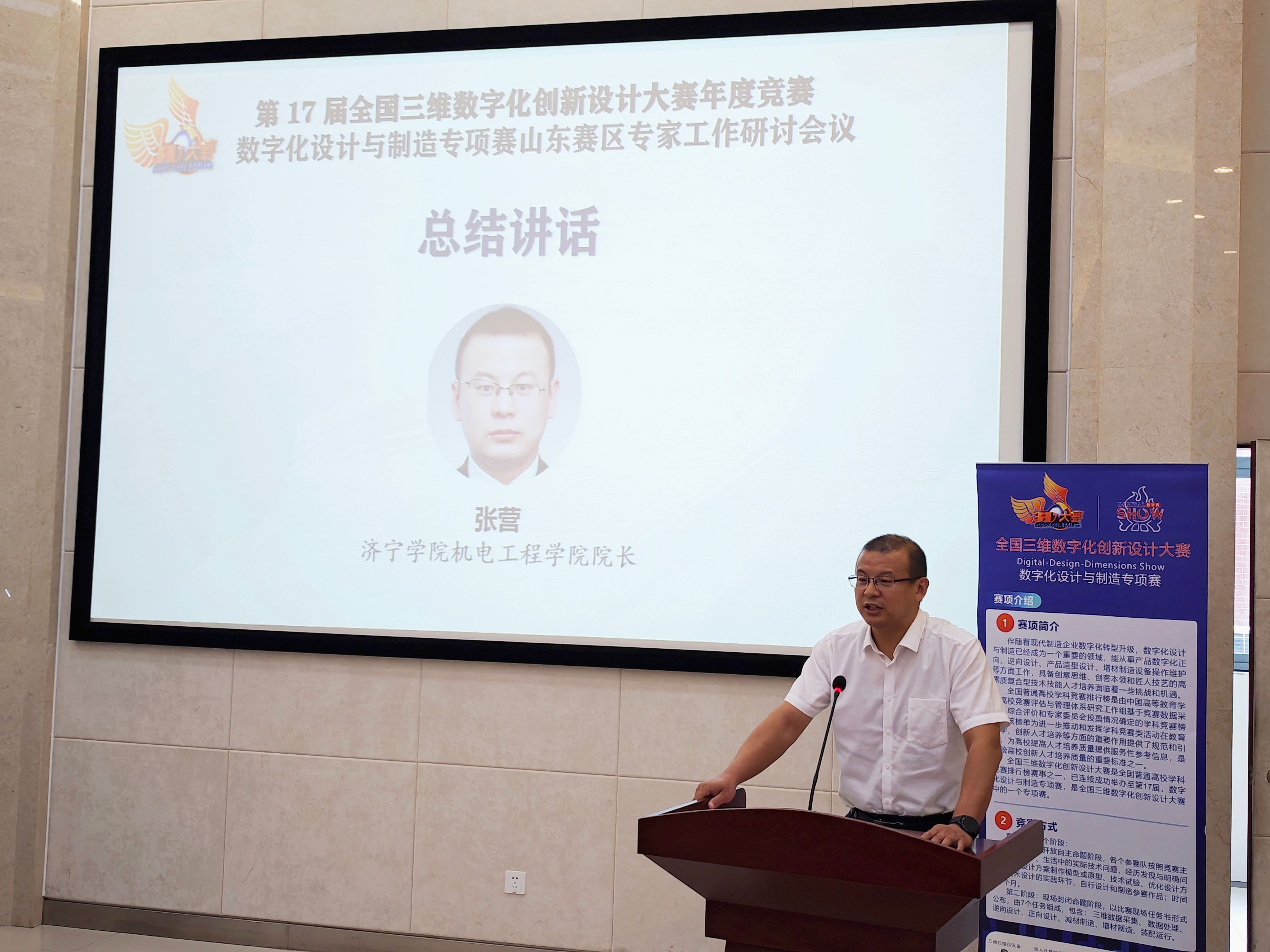 张营在研讨会上做了总结讲话,并表示长期的教育实践使我们深刻洞察到数字化设计与制造技术在重塑现代制造业格局、加速产业升级、以及提升全球竞争力中的不可或缺性。这一技术不仅是制造业创新的核心驱动力,也是培养未来技能人才、促进教育与产业深度融合的关键要素。因此,我们一直以来都高度重视数字化设计与制造技术的教育与培训工作,致力于为学生提供更为优质的教育资源和实践平台。在大家的共同努力下,一定能够推动数字化设计与制造专项赛(山东赛区)的深入发展,为制造业转型升级做出积极贡献。