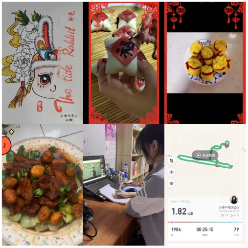 同学们拍摄具有年味的照片或表演展示独立创作与节日相关的艺术作品,录制了年夜饭菜肴的制作流程和成品,拍摄了菜肴的享用视频和照片,对每日运动、学习生活等进行打卡。