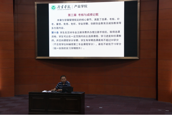 周珂通过自己学业生涯的回顾分享,给新生讲授如何成为老师、企业、社会认可的优秀学生。她希望大学生要具备会听、会看、会写、会演讲、会辩论的能力,在“听”中会辨别,在“看”中会思考,在“写”中会凝练,在“演讲”中会展现自我,在“辩论”中实现全面提升。她表示要和产业学院全体教师一起期待四年后同学们展现的成长记录。副院长张长茂介绍了学校学籍管理规定,教育引导全体新生做好符合自己的大学生涯规划。