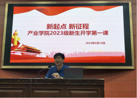 王振平代表学院向全体2023级新生表示热烈欢迎,围绕大学生理想信念教育讲授“开学第一课”。他强调大学是人生的新起点,希望同学们正确认识自我、找准定位,努力成为充满青春志气、青春底气、青春锐气和青春活力的青年学生,结合产业学院实际,产业学子要在坚定理想信念中展现志气,在自信自立自强中展现底气,在练就过硬本领上展现锐气,在社会实践锻炼中展现活力。同学们最重要的就是学习新知识、掌握新本领,朝着既定的目标奋进,这也是老师们最期许的学生时代最美的奋斗姿态。