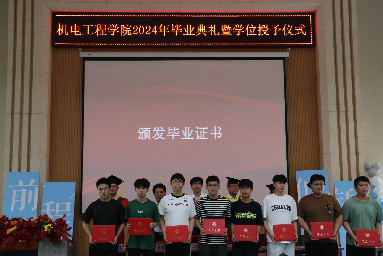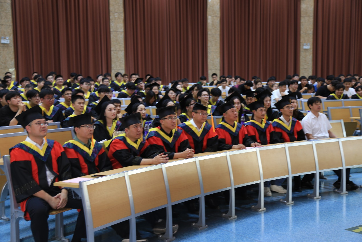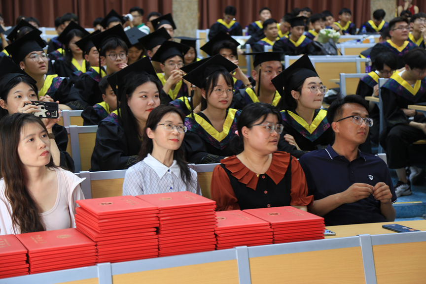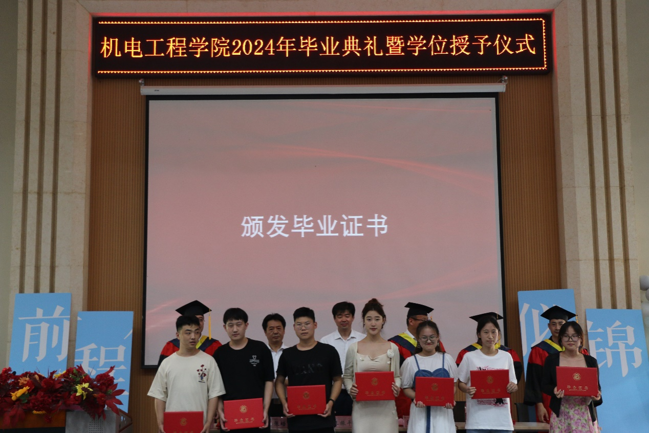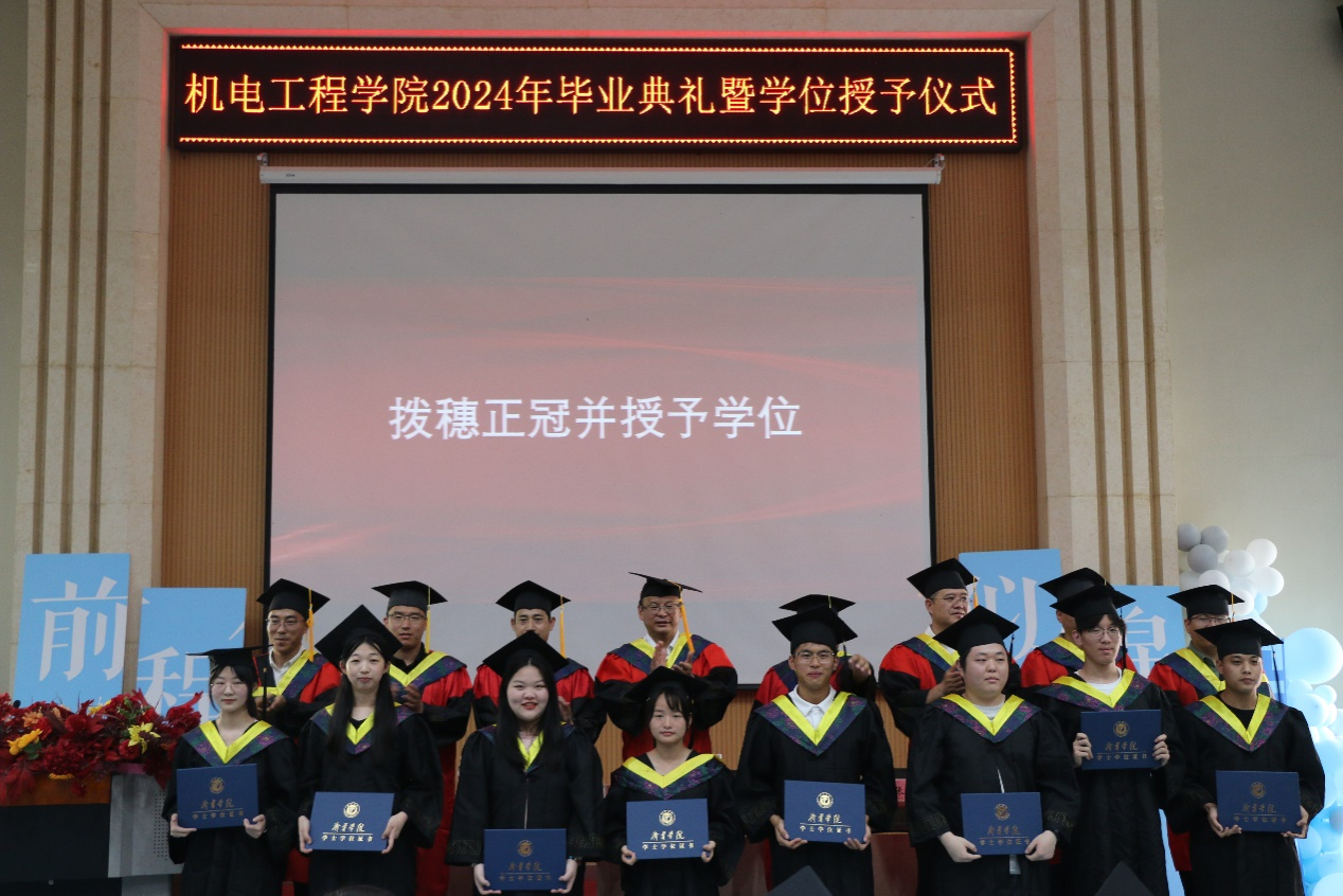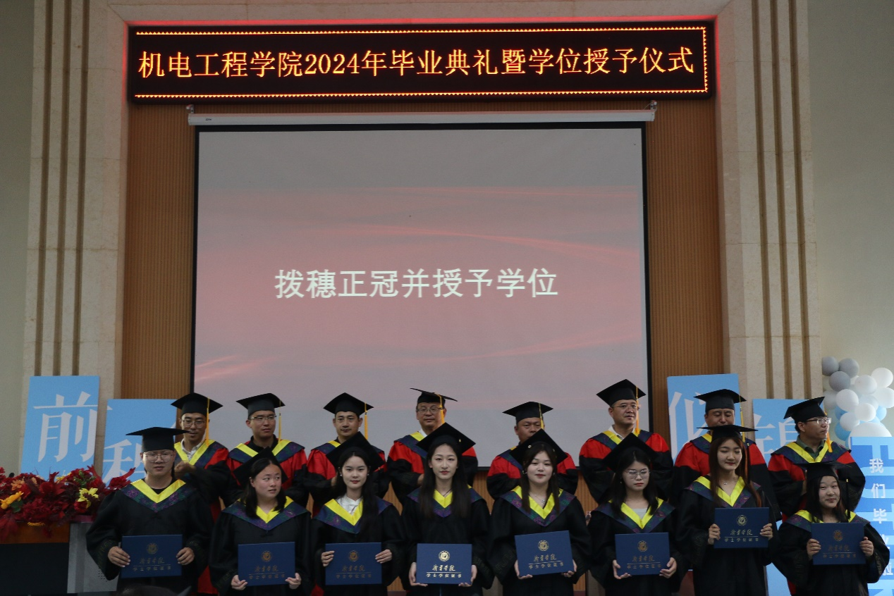 张长茂宣读了毕业证书颁发决定、安磊宣读了学位授予决定。学院领导班子成员一起为毕业生颁发毕业证书,学术委员会成员为毕业生拨穗正冠、颁发学位证书,与同学们合影留念。