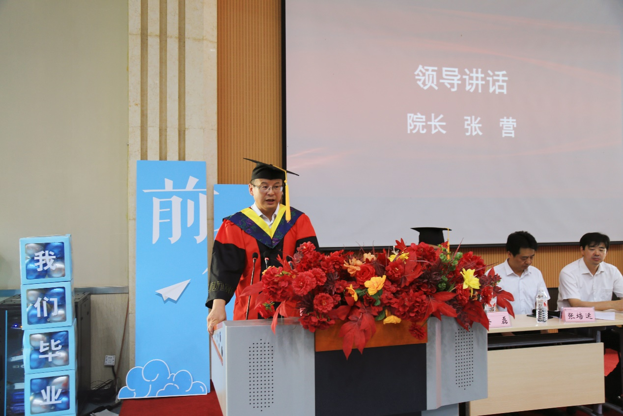 毕业典礼在庄严雄壮的国歌声中拉开帷幕。张营代表学院和全体师生,向圆满完成学业的毕业生表示热烈祝贺和美好祝福,对各位老师和家长的辛勤付出表示衷心的感谢。他向全体毕业生提出希望,一要勇于承担责任,敢于担当作为,为实现中华民族伟大复兴的中国梦贡献力量。二要保持谦逊与敬畏,永远保持学习的热情,以更加扎实的专业素养和更加广阔的视野去迎接未来的挑战。三要勇于创新实践,不断提升自己的综合素质和能力水平,追求卓越,勇攀高峰,在各自领域取得更加辉煌的成就。四要心怀感恩,铭记母校和老师的恩情,将这份感恩之情转化为前进的动力,用实际行动回报社会。