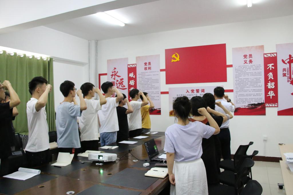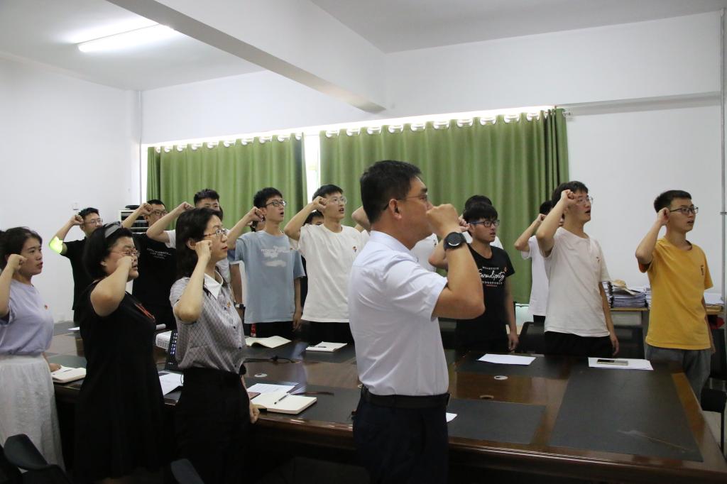 在“七一”来临前,6月17日产业学院学生党支部在产业学院会议室举行“重温入党誓词 不忘初心使命”主题党日活动。产业学院党委书记苏宁同志领誓,学生支部书记王琪同志监誓,党委副书记秦胜营、辅导员王晓虹、武晨曦、王要刚和全体学生党员参加宣誓。